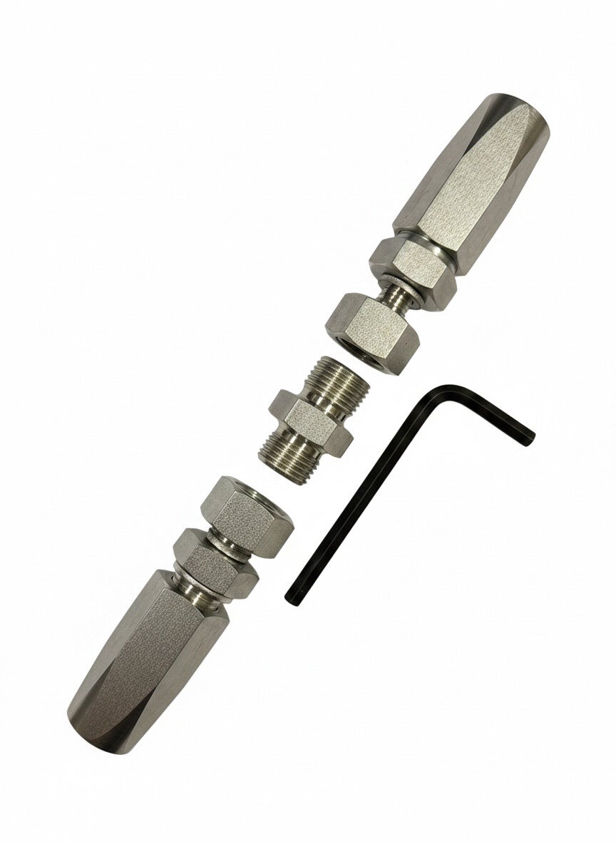 High-quality reusable fitting kit designed for quick and reliable hydraulic hose connections. Each kit includes two durable coupling, joining nipple, and an Allen key for easy installation.
